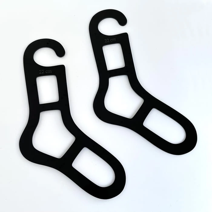 Nasze blokery wykonane są z 3 mm czarnego akrylu. Nie trzeba dodatkowo ich zabezpieczać lakierem jak blokerów drewnianych. Można od razu zakładać na nie wilgotne skarpetki. Blokery do skarpet z plexi są lekkie, ale wytrzymałe i trwałe. Na każdym wygrawerowany jest rozmiar. Występują w pięciu rozmiarach od 22 cm do 26 cm (w odstępach centymetrowych). Na górze blokery mają wygodny w użyciu haczyk. Z łatwością odwiesisz swoje skarpetki do wyschnięcia.
