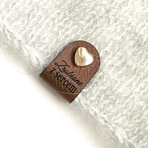 Metka składana z ekoskóry Dekor z nitem w kształcie serca. Naszywka posiada napis "Zrobione z sercem. Metka mocowana jest do dzianiny przy pomocy nitu. Można ją łatwo zdjąć do prania, albo przełożyć w inne miejsce.