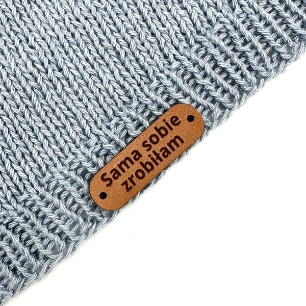 Metka z ekoskóry z napisem "Sama sobie zrobiłam". Posiada dwie dziurki ułatwiające przyszycie.