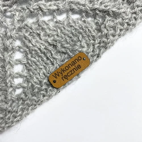 Metka z ekoskóry z napisem "Wykonano ręcznie". Posiada dwie dziurki ułatwiające przyszycie.