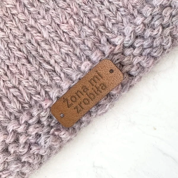 Metka z ekoskóry z napisem "Żona mi zrobiła". Posiada dwie dziurki ułatwiające przyszycie.